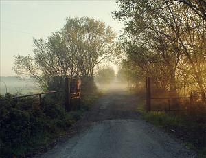 Come: L'autore ha usato un'ottica grandangolare con un'ampia profondità di campo, eseguendo un'inquadratura frontale, senza inclinazioni, ad altezza occhi, con una lieve angolazione verso il basso. Il tempo è immobile. La struttura del cancello appare perfettamente parallela ai lati del quadruccio e disposta in posizione quasi centrale all'immagine. La strada asfaltata è disposta anch'essa centralmente e si allontana in prospettiva verso il centro dell'immagine. La vegetazione ai lati della strada incornicia il percorso stradale guidando lo sguardo in questo campo lungo. Sullo sfondo è presente della foschia che rende indistinti e vaghi i contorni visivi dello spazio che recede donando un effetto di profondità. La luce è naturale, mattutina, e diffonde...