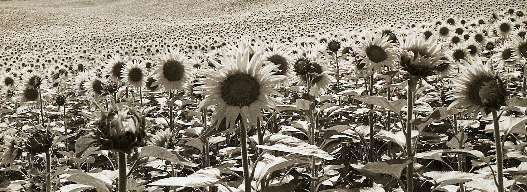 Ampia scena di girasoli come un esercito che avanza.