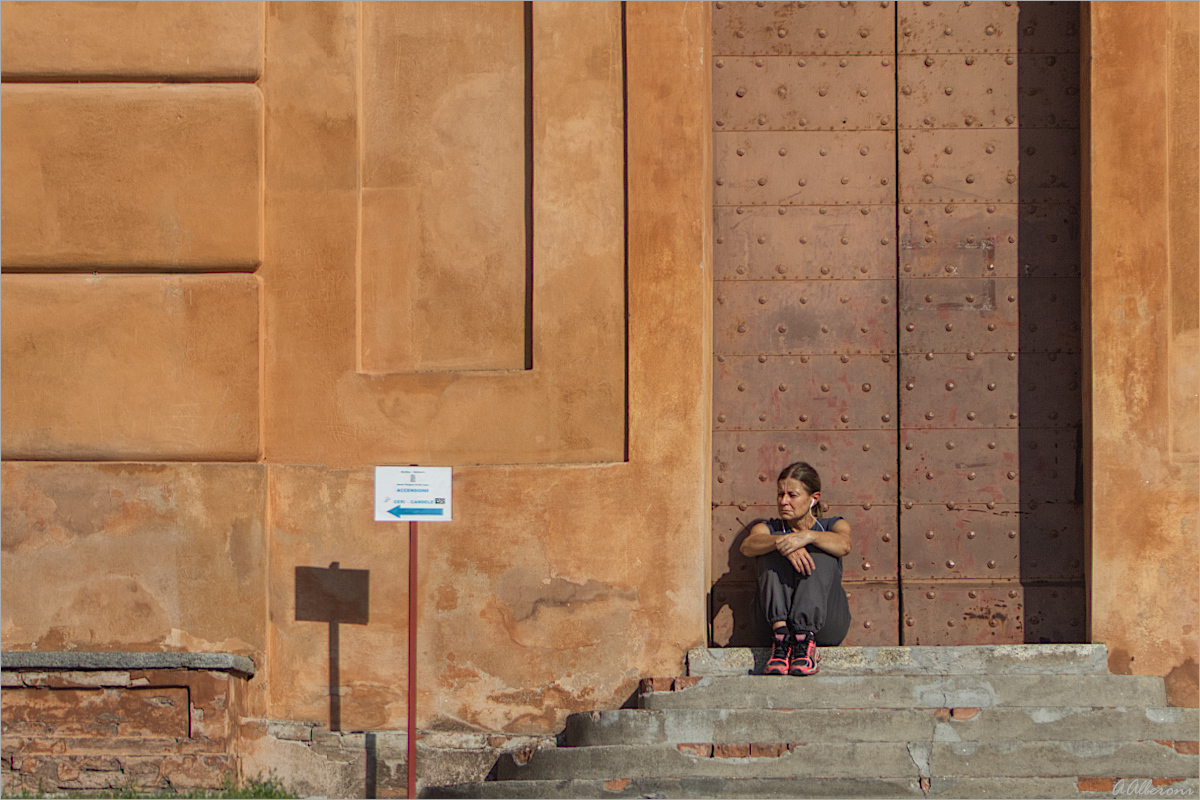 L'espressione della signora è veramente truce e forse per questo interessante, mi piace il contesto con il portone bugnato e le tinte calde della scena.