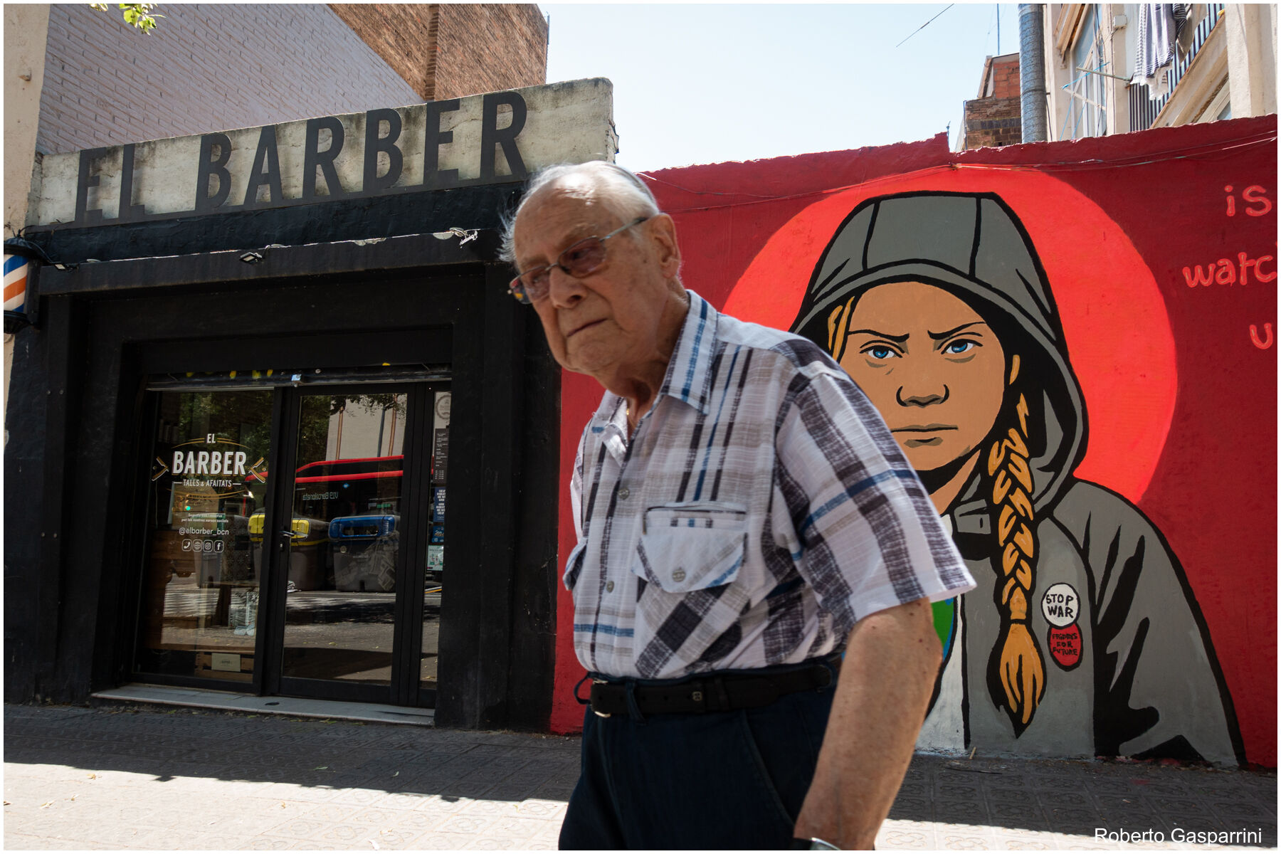 Il negozio del barbiere confonde e distrae dal messaggio più forte presente nello scatto, avrei optato per un taglio che lo escludesse almeno parzialmente dal fotogramma. Parere personale.