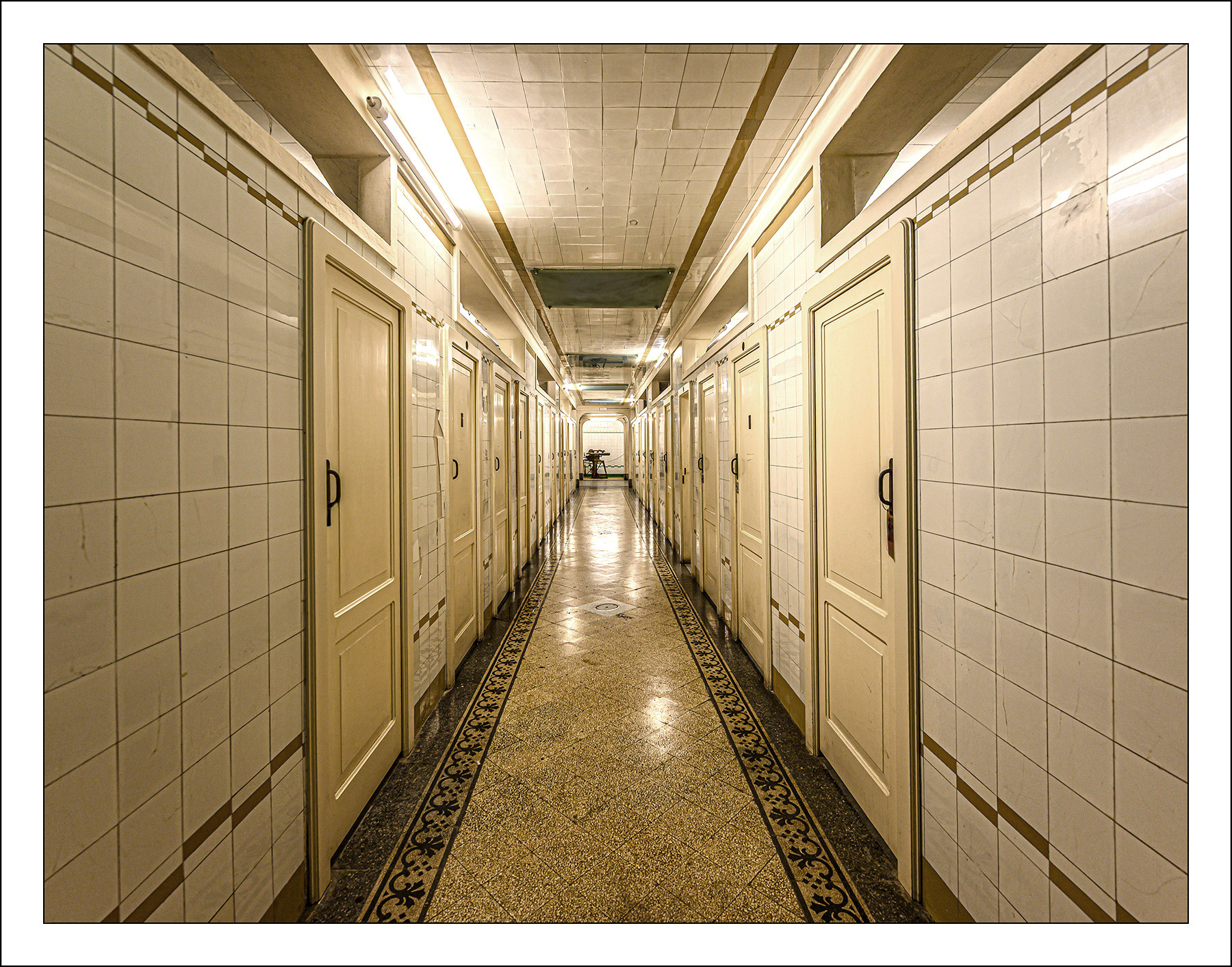 Questa fotografia cattura un profondo quasi inquietante senso di mistero e isolamento.L'uso centrale della prospettiva è dominante. Le due file di porte identiche e le pareti rivestite di piastrelle bianche creano delle linee guida fortissime che convergono verso un punto di fuga lontano, generando una impressione di infinito, sensazione di ordine ma anche di uniformità claustrofobica. Ciao Gianni.